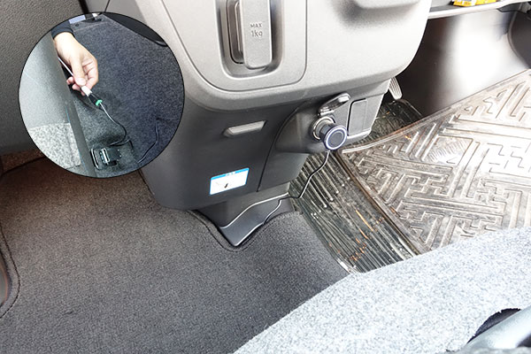 10.延長コードをピラー内を這わせ、 助手席下まで伸ばします。
