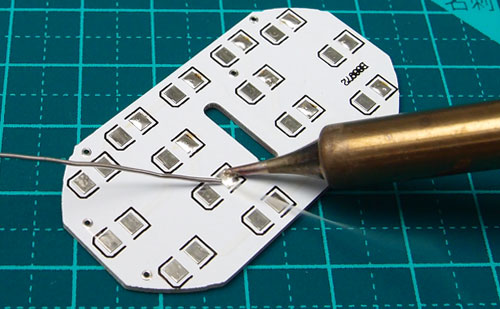 | 3.片側15カ所ハンダ付けしたら 反対側もハンダ付けします。 LEDの電極と基板のランドにコテを当て熱を掛けてからハンダを流し込みます。 ※熱の掛け過ぎに注意 |
