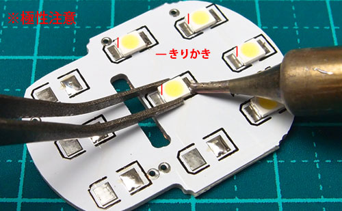 | 2.チップLEDはきり欠きのある方が、カソード(-)です。 チップLEDの切り欠きと基板の-側を合わせてハンダ付けして下さい。 盛ってあるハンダを溶かして、チップLEDを潜り込ませるようにハンダ付けします。 ※熱の掛け過ぎに注意 |