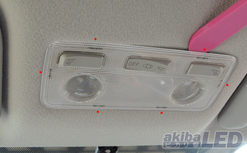 | 1.まず電源をOFFにしてから、内張剥がし等を使用してレンズを外します。赤点の6カ所がロックになっています。折ったり傷を付けないように慎重に行って下さい。 |