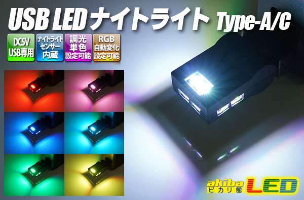 USB LEDナイトライト DC5V専用、照度センサー付きのRGBナイトライトです。 USB接続しておくだけで周囲が暗くなる夜間に点灯、 単色発光やグラデーション発光などが可能です。 モバイルバッテリーと繋いでアウトドア使用や、 USB給電機器に接続して夜間灯などにご利用ください。 ■製品仕様 発光色 : RGBフルカラー(LED8灯) 入力電圧 : DC5V (USB給電Type-AまたはType-C) 消費電力 : 約0.5W 本体寸法 : 23×15×10mm(約)(USB端子部含まず) プラグ形状: USB TypeA 又は USB Type-Cをお選びください ※単体では光りません、モバイルバッテリー(DC5V)等に接続して下さい。 ※明るい場所では約15秒で消灯します。 ■コネクタをお選びください USB LEDナイトライト Type-A 1,280円/個 USB LEDナイトライト Type-C 1,280円/個 ■操作方法 スイッチボタン 単押し 赤→橙→黄→緑→シアン→青→紫→白→グラデーション の順で発光色変更 スイッチボタン 長押し 明るさがアップ・ダウンするので希望の明るさで離して調光(単色のみ) スイッチボタン 2度押し ホタル点灯モード切り替え スイッチボタン 3度押し 点灯箇所が順に光ります。希望の点灯配置でスイッチを押して設定完了 中国製 ■ご注意 ※ロットにより仕様が変わる場合があります。 ※低電力で自動停止するモバイルバッテリーへの接続の場合、 自動では再点灯しませんのでご注意ください。 ※商品はすべて出荷前に点灯確認をしておりますが、 取り付けの前に必ず点灯確認をお願いいたします。 ※本製品をPC等の重要なデータを扱う機器に接続しないでください。 (供給電力の不足により他のUSB機器の動作が停止し、 | 重要なデータが失われる場合があります) ※保証は、商品到着後7日以内の初期不良の物に対して行います。 万が一不具合のある場合には、商品到着後7日以内にご連絡下さい。 ※本製品の分解・改造・修理や取り付け後は保証の対象外となります。 ※いかなる場合にも、本体代金以上の保証はいたしません。 上記ご了承の上お買い求め下さい。