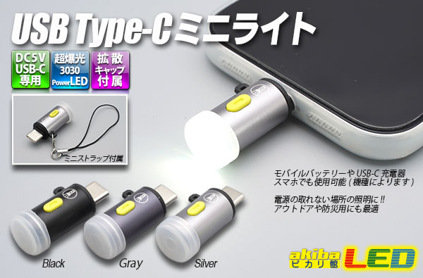 USB Type-C ミニライト USB Type-C専用、とても明るいミニライトです 明るい3030ChipLEDを使用し、 アルミ筐体でUSB Type-Cに接続するだけの簡単点灯 拡散用キャップ付属で柔らかい広角使用も可能です アウトドアや懐中電灯・緊急時の手元灯などにご利用ください ■製品仕様 発光色 : 白色 入力電圧 : DC5V (USB Type-C) 消費電流 : 0.2A 消費電力 : 1W 全光束 : 210-230lm 本体寸法 : 31×12.8mm(約)(突起部含まず) プラグ形状: USB Type-C 付属品 : 拡散キャップ・ミニストラップ ※単体では光りません、モバイルバッテリー(DC5V)等に接続して下さい。 ■本体カラーをお選びください USB Type-C ミニライト シルバー ブラック グレー 1,280円/各1個 中国製 ■ご注意 ※ロットにより仕様が変わる場合があります。 ※スマートフォンでご利用の場合機器や設定により点灯しない事があります。 ※商品はすべて出荷前に点灯確認をしておりますが、 取り付けの前に必ず点灯確認をお願いいたします。 ※本製品をPC等の重要なデータを扱う機器に接続しないでください。 (供給電力の不足により他のUSB機器の動作が停止し、 | 重要なデータが失われる場合があります) ※保証は、商品到着後7日以内の初期不良の物に対して行います。 万が一不具合のある場合には、商品到着後7日以内にご連絡下さい。 ※本製品の分解・改造・修理や取り付け後は保証の対象外となります。 ※いかなる場合にも、本体代金以上の保証はいたしません。 上記ご了承の上お買い求め下さい。