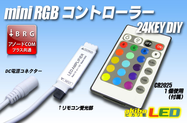 MINI RGBコントローラー24KEY 便利な24Keyリモコン付属のRGBコントローラーです。 RGBのテープLEDと組み合わせて、簡単に発光色をコントロールできます。 他のコントローラーのように細かい色の調整などはできませんが、 基本的コントロールに絞って大変お安くなっております。 ■セット内容: MINI RGBコントローラー本体×1台 1セット:630円 専用リモコン ×1個 動作確認用ボタン電池CR2025×1個 入力電圧: DC5V/12V/24V 定格電流: 3色×2A 寸 法: L48×W12×H5.5mm(約)(突起部含む・コード含まず) コード長: 電源コード 13cm(約) 接続方式: アノードコモン(プラスが共通) 極 性: +BRG ※写真中の電源・テープLEDは別売りとなります。 ■テープLED点灯には、電源、ACアダプター(別売)等が必要になります。 ご使用になるテープLEDの詳細ページを参考に電源をお選び下さい。 中国製 ■ご注意 ※入力電圧と接続製品の電圧は必ず同じ物をご利用ください。 ※テープLEDを接続、カットする際には必ず電源を切ってから作業して下さい。 ※簡易説明書付き。 ※コントローラー及びリモコンは防水ではありません。 コネクタ接続部は収縮チューブやシリコンテープ等で防水してください。 ※当社製品以外のテープLED等を接続された場合、保証対象外となります。 ※出荷前に点灯の確認を行いますが、 万が一不具合のある場合には到着後1週間以内にご連絡ください ※取り付け後の交換・返品には一切対応できません。 上記ご了承の上お買い求め下さい。 |